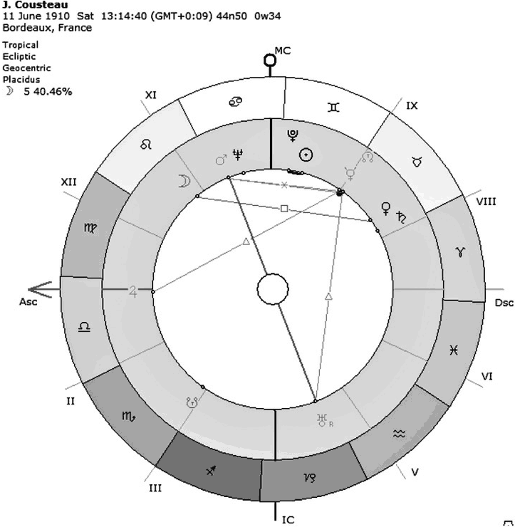 В гороскопе Кусто ключевой планетой является, скорее всего, Марс – четыре аспекта, в том числе точная оппозиция с Ураном. Другой кандидат на эту роль – Меркурий. Тоже четыре аспекта, и хотя напряженных среди них нет, на Меркурий замыкается все та же точная оппозиция Марс – Уран. Поскольку Марс и Меркурий имеют аспект и друг с другом, можно сказать, что они вдвоем образуют важнейшую ключевую комбинацию гороскопа.