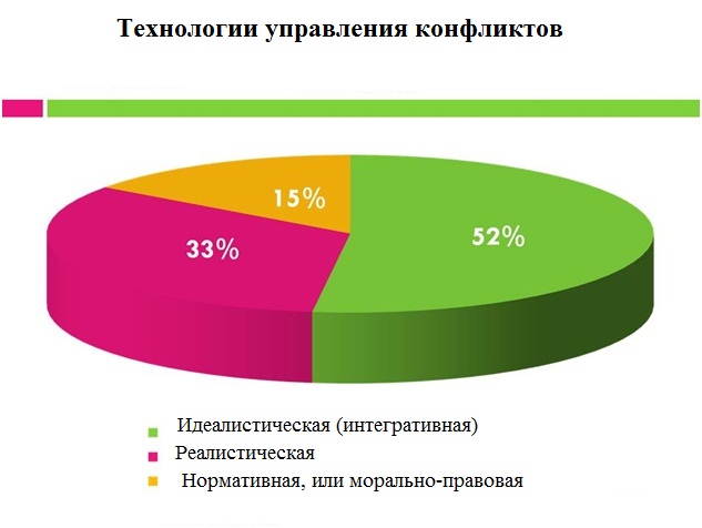 Нормативная, или морально-правовая технология, способствует использование в решение конфликтов правовых инструментов и уставу компании (нормы поведения). Конфликт рассматривается в правовом поле, поэтому решения конфликта в первую очередь зависит от нарушения правил и норм поведения конфликтующих сторон (проигрыш-проигрыш). Реалистическая технология использует авторитарные методы управления конфликтом, используя методы доминирования и силы в своих интересах (выигрыш-проигрыш).