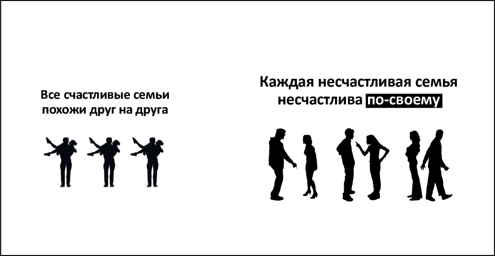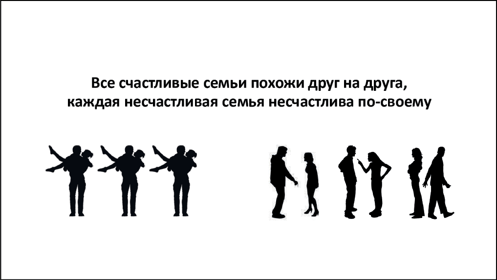 Где бы в реальной жизни толстовская цитата могла появиться? Например, в докладе студента-психолога или популярной лекции психотерапевта, работающего в центре семейной терапии. Допустим, наш вымышленный спикер хочет рассказать о том, что разным парам в зависимости от их проблем и типов личности подходят разные психотерапевтические школы и техники. Кому-то – когнитивно-поведенческая, кому-то – гештальт-терапия, а кому-то – транзактный анализ. Фраза, которую он выбрал для начала разговора, безусловно, вызовет понимающую улыбку у слушателей. Но как сделать слайд выразительнее, интереснее?