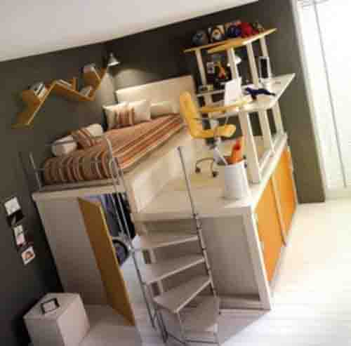 Позднее, уже в начале 2000-х, получили распространение решения, когда кровать, наоборот, размещается внизу и выдвигается по мере необходимости (или наоборот). Наверху же размещается рабочее место и прочая мебель. Иногда встречаются довольно сложные комбинации. Чаще всего такие решения предлагаются для подростков.