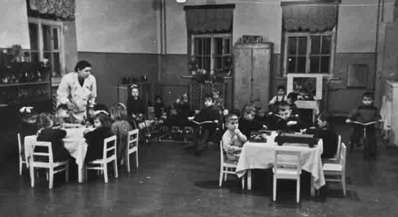 Но, и в 30-х, и в 50-х годах ХХ века интерьеры советских детских садов отличались от обычных «взрослых» интерьеров только приспособленной уменьшенной мебелью и могли быть вполне в духе «правильной политики».