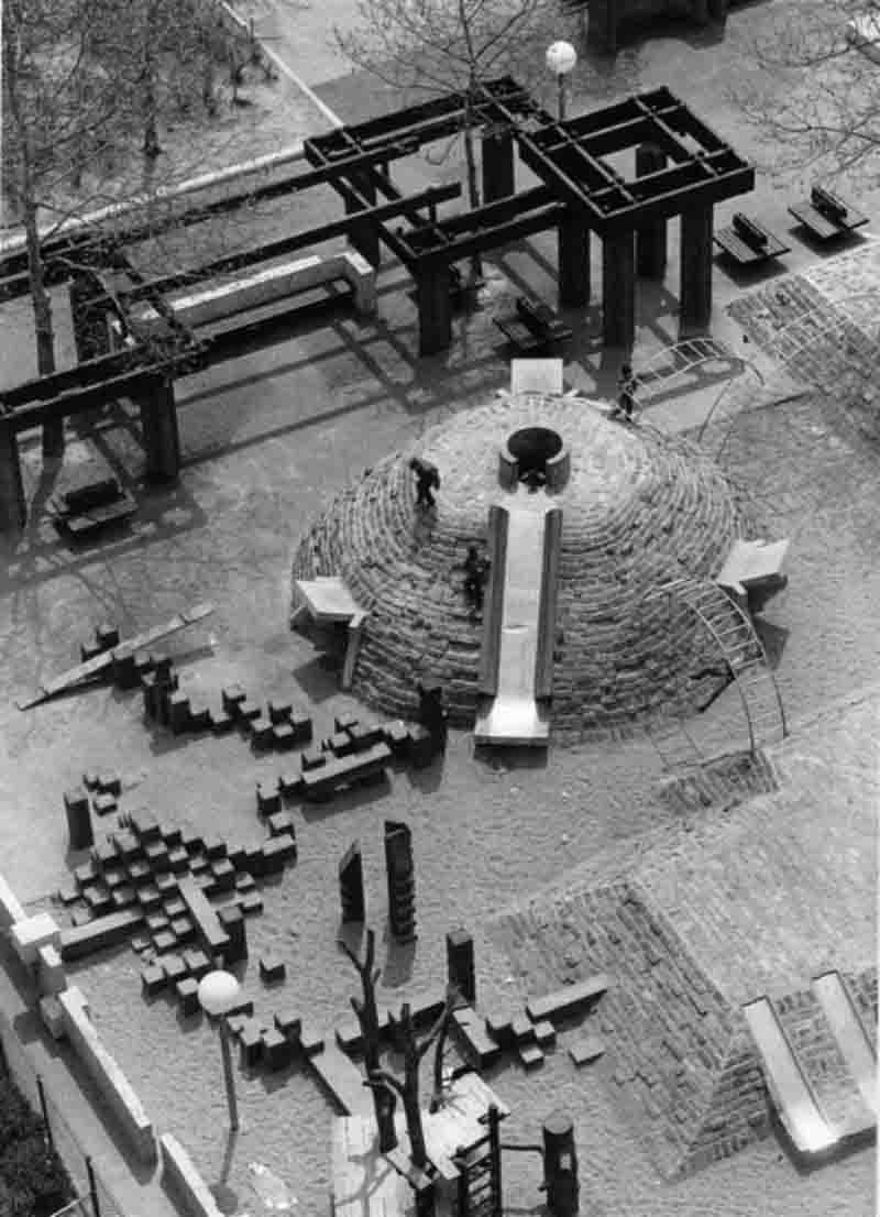 На Западе в 60–70-е годы детские площадки оказались в фокусе внимания дизайнеров и архитекторов. Этот период ознаменовался попытками архитекторов подойти к сооружению детских площадок с теми же мерками, что и к «большой» архитектуре, что привело к серии экспериментов в области формообразования. Идея была хороша – раз без детских площадок нельзя обойтись, то почему нельзя сделать их полноценным элементом городского ландшафта, важной в эстетическом плане частью городской архитектуры? В процесс проектирования площадок начал проникать средовой подход, который отличается тем, что архитектор или дизайнер пытаются не просто благоприятно расположить отдельные игровые элементы, а создать особую среду способную через разнообразные пространственные вариации предоставить детям более широкие возможности для игр и компенсировать монотонность окружающей застройки,