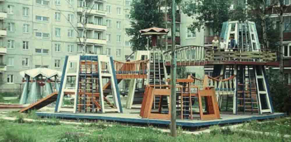 Тем не менее, именно тогда начал складываться «золотой стандарт» детской игровой площадки, включавший подвесные и наземные качели, маленькую карусель (которая раскручивалась молодёжью до космических скоростей), деревянную или металлическую горку, металлическую конструкцию для лазания, песочницу с грибком-навесом, а также скамейки для родителей. К этому богатству мог прилагаться отдельный теневой навес. Иногда этот набор дополнялся деревянными качалками, которые, в отличие от современных, могли не иметь ограничителей и потому иногда переворачивались. Подвесные качели также могли иметь втулки, которые позволяли делать полный оборот вокруг оси, что автор данной книги и проделывал неоднократно. Кроме того, на некоторых площадках сооружались небольшие сцены для проведения различных мероприятий.