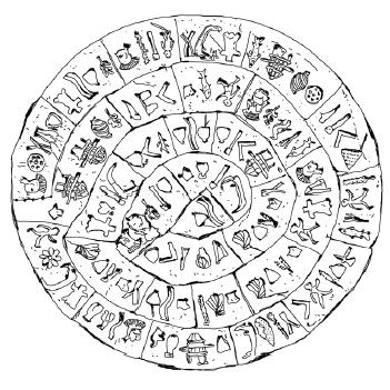 На греческом острове Крит нашли небольшой диск, покрытый крохотными изображениями – фигурками людей, кустами, птицами, рыбами. Всего на диске двести сорок одна фигурка. Но разных только сорок пять, остальные все повторяются. Эти сорок пять фигурок – алфавит неизвестного нам языка. Слова отделяются одно от другого черточками. Только недавно удалось частично прочесть эти таинственные письмена. Ученые определили, что диску четыре тысячи лет.