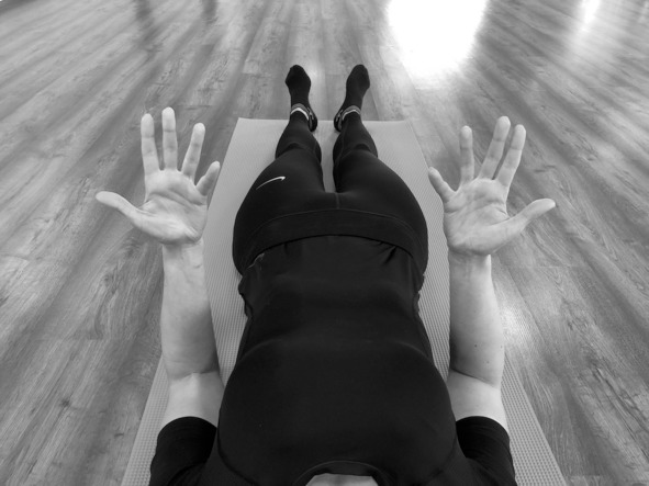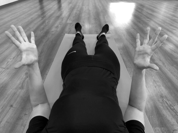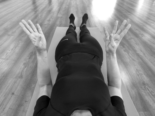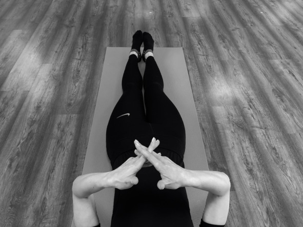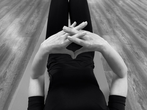 Исходное положение: лёжа на спине, руки приподняты над животом, пальцы обеих кистей сложены между собой, соприкасаясь в области средних фаланг (проксимальных межфаланговых суставов); прямые большие пальцы рук соприкасаются подушечками между собой.