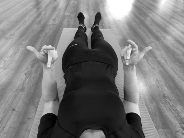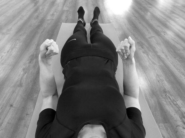 Исходное положение: лёжа на спине, руки приподняты над животом, большой палец правой руки отведён в сторону, ладонь левой руки наложена на большой палец правой руки сверху него.