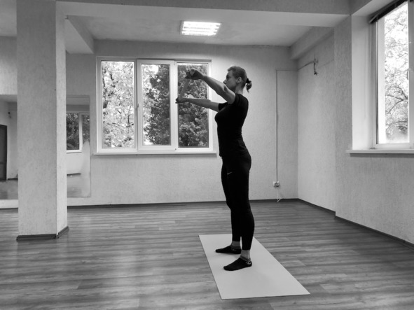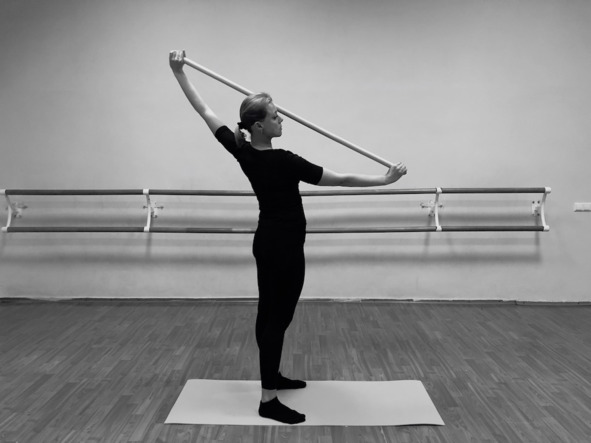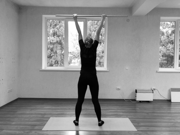 Техника выполнения: поднимаем виргу максимально вверх за спиной и фиксируем её в данном положении, приняв его за нижний уровень (положение 1). Выполняем короткие рывковые движения руками вверх из положения 1 и обратно (рывки). Движения резкие. 20 повторений. Далее, из положения 1 выполняем повороты туловища влево и вправо, стопы не отрываются от пола. Движения плавные. 10 повторений.