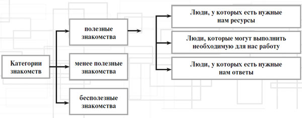 Итак, если мы говорим о построении эффективной личной сети деловых связей, то мы всегда должны понимать, для каких целей мы знакомимся и какой существует общий подход к категориям нужных связей.