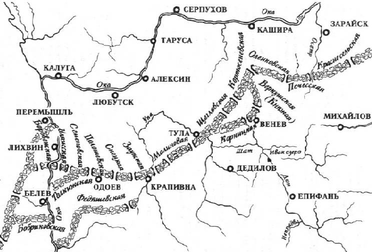 Самые замечательные леса в губернии, это, так называемыя засеки; они занимают 39,067 д. и тянутся полосою, от 4 до 5 верст ширины, по направлению от запада к востоку; от Тулы одна полоса идет до Белева, с отраслью в Каширский уезд и состоит из засек: Щегловской, Веневской, Карницкой и Картачевской, а другая полоса от Тулы пролегает в противную сторону, вниз по реке Упе, через Тульский, Одоевский уезды, под названием Малиновской.