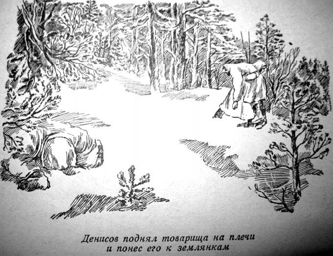 Да… Вот это была выдержка!.. Денисов поднял товарища на плечи, взял винтовку и, проваливаясь по колена в снег, понес его к землянкам.