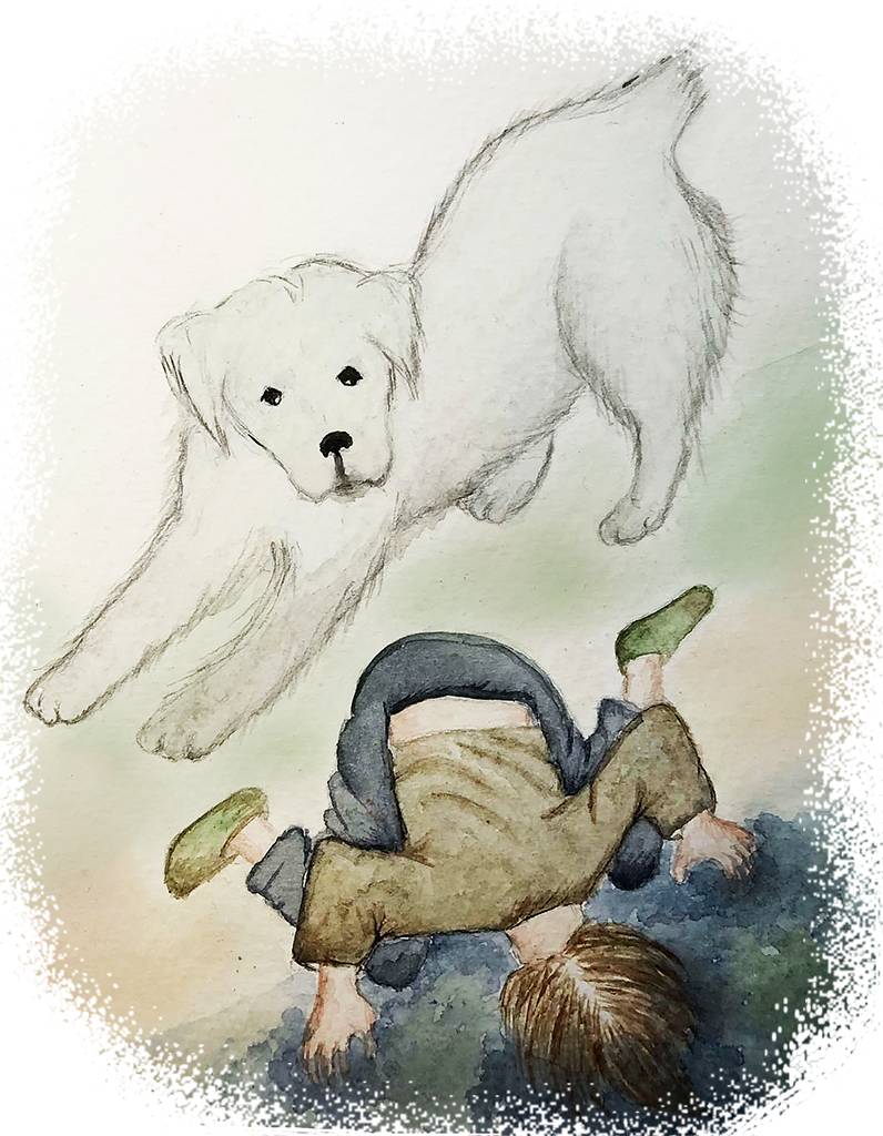 – Да вот же она! – Май показывал на собаку, которая медленно шла к нему, – дедушка, спаси меня! – Май бросился за спину Августа.