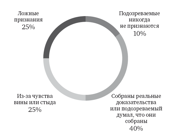 По статистике, которую я услышал от Стена Уолтерса[2] на его лекции в 2018 году (сейчас цифры я помню приблизительно), 40 % людей признаются из-за того, что в отношении них были собраны реальные доказательства, ли бо по причине предположений, что на них собраны доказательства; 25 % людей признаются из-за чувства вины или стыда; 25 % делают ложные признания – чтобы скрыть иное преступление, выгородить другого человека, или чтобы допрос прекратился; 10 % никогда и ни в чём не признаются. По моему опыту, эта статистика реальна и применима к практике получения признания. Из этого следует, что в беседе с подозреваемым необходимо умело предъявлять факты (доказательства) и уметь вести беседу и управлять моральным состоянием подозреваемого.
