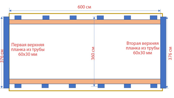 Жесткость всей конструкции обеспечивают две поперечные планки – первая верхняя и вторая верхняя, показанные на рис. 6. Их длина 376 см, и они на верхнем уровне скрепляют всю конструкцию. Они или привариваются, или же закрепляются мощными болтами.