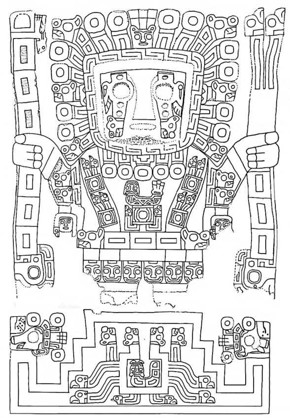 – «Фигуры с крылатыми людьми и головами кондоров обращены к большой центральной фигуре Бога, словно в обожании, и каждый держит перед собой жезл или скипетр»;