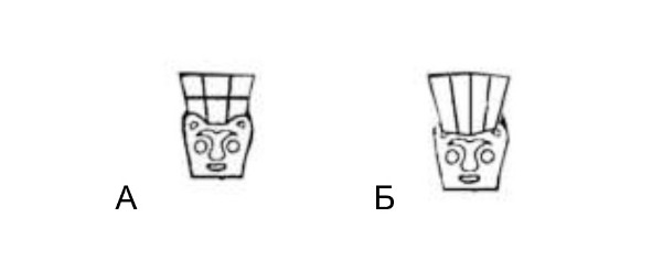 В литературе и в Интернете дано большое количество изображений Верховного Бога на Вратах Солнца в Тиуанако. При этом четко выделяются два варианта исполнения знака планеты Меркурий. Меркурий – ближайший к Солнцу, поэтому он изображен ближе всех к цепочке меандра, отображающей Солнце. На всех рисунках Меркурий показан значком в виде лица и геометрических фигур в самой верхней и центральной точке изображения Верховного Бога – рис. 9А, рис. 9Б.
