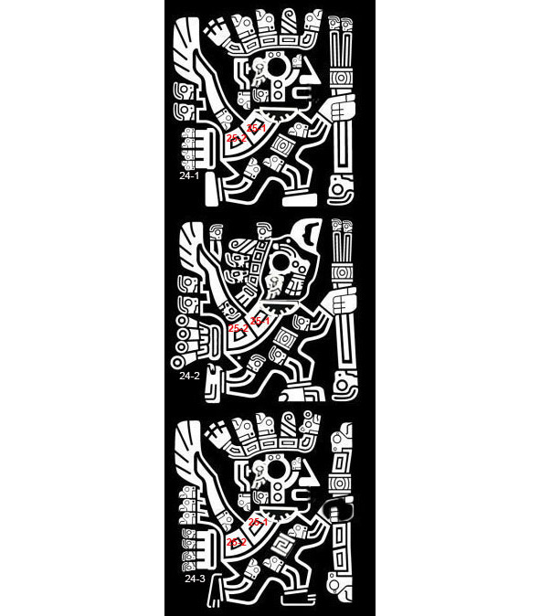 Следует отметить еще одно обстоятельство. Напротив основания значка Юпитера на всех трех рядах пернатых божеств изображена нога. Причем в период до последней катастрофы (поз 24—3 на рис. 71), нога имеет черный фон, что свидетельствует о том, что произошла ранее катастрофы. Этот же факт, как уже было отмечено, запечатлён четырьмя разбитыми мордами ягуаров. Теперь передвигаемся к позиции 24—2 на рис. 71, или к среднему ряду пернатых божеств. Именно в эту эпоху произошла последняя катастрофа. Что же мы видим? Рядышком с продолговатой эллипсообразной основой значка Юпитера, т.е. самого Юпитера, расположена нога с тремя белыми пальцами в одну сторону и одним пальцем в противоположную сторону. Это изображение ноги отличается от ноги в нижнем ряду. Что же произошло? Здесь применен принцип аналогии. Четыре сформированные спутника Земли распределены аналогично: три в одной стороне четвертый в противоположной.