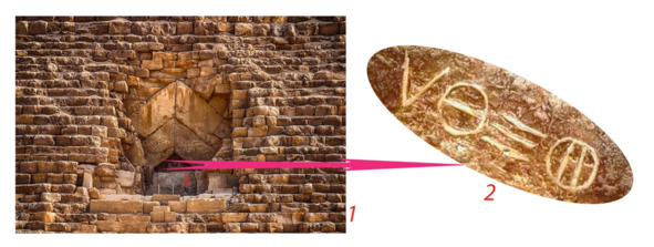 1 – область старого входа в пирамиду Хеопса, который сейчас закрыт, а надпись прикрыта бетонными плитами.