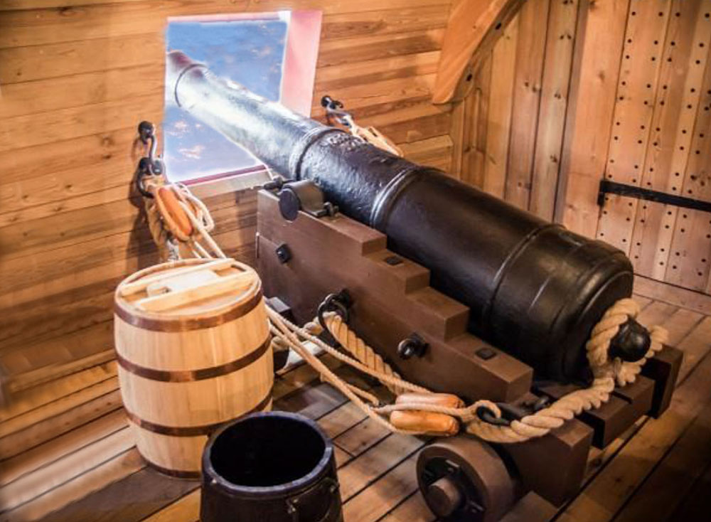 А здесь показана внутренняя или нижняя палуба с пушками. Рядом с пушкой стояли бочонки с порохом.