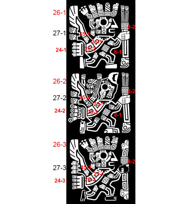 Теперь обратимся к реальному календарю Тиуанако. Учитывая, что Сатурн – шестая планета от Солнца, и количество больших спутников, которое составляет пять или шесть. В общей картине календаря есть одно такое изображение – позиции 26—1, 26—2 и 26—3 на рис. 72. Сатурн изображен в виде хвоста, у которого количество перьев равно числу больших спутников – пять.