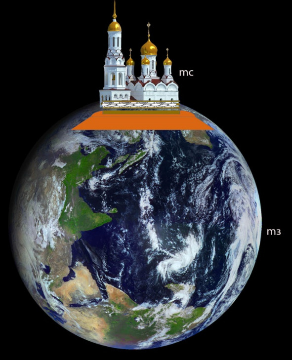Рис. 13. Составил автор, Александр Матанцев. Соотношение массы Земли и массы колокольни и храма