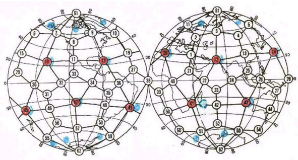 Икосаэдро-Додекаэдрическая Система Земли (ИДСЗ) – «Русская Сетка». И Стоунхендж, и великие пирамиды Египта, и пирамиды Центральной Америки, и Байкала и очень много других мест попадают на «живительные» пятиугольники «Русской сетки». Наверное, это не случайно, т.к. пятигранная симметрия – это символ жизни, она на Земле встречается только у живых организмов пять лепестков у яблони, груши, гвоздики, у морских звезд и ежей. В кристаллографии на Земле вы не встретите правильные пятиугольники. Потому в «Русской сетке» вершины или ребра пятиугольников указывают на «места силы». Исследования Гончарова Н. Ф., Макарова В. А., Морозова В. С. начинались с предположения, что система очагов древних культур и цивилизаций возникла от воздействия геометрически подобной структуры геофизического характера. Имеется достаточно много убедительных свидетельств того, что земной шар представляет собой кристаллическое тело. На поверхности Земли наблюдаются как бы проекции вершин и рёбер двух совмещённых правильных многогранников – икосаэдра (из 20 треугольников) и додекаэдра (из 12 пятиугольников). Линии пересечения основных фигур каркаса (треугольников и пятиугольников) совпадают с океаническими хребтами, планетарными разломами, зонами активных подъемов и опусканий земной коры. Этот силовой каркас, как выяснилось, оказывает определённое воздействие не только на земную кору, но и на гидросферу, атмосферу, биосферу, магнитное и гравитационное поле Земли. Таким образом, «узлы» системы подобны выходам своеобразных «силовых осей» Земли, определяющих её силовой каркас; и всем этим событиям даётся энергетическая трактовка. Было сделано важное наблюдение, что движение вещества поверхности земной коры происходит, в основном, от рёбер и вершин додекаэдра к рёбрам и, соответственно, к вершинам икосаэдра (или то же самое: от центров треугольников к их вершинам). Таким образом, 20 районов планеты (вершины додекаэдра) – центры потоков восходящего вещества, а 12 районов (вершины икосаэдра) – центры нисходящих потоков.