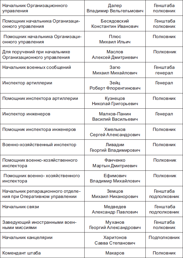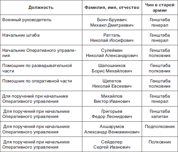 Полевой штаб возглавляли генералы Генштаба Раттель Н. И., Костяев Ф. В., Бонч-Бруевич М. Д., Лебедев П. П. Во вновь созданной Красной армии все ведущие командные посты занимали бывшие офицеры и генералы. Так Южным фронтом командовал генерал-лейтенант В. Егорьев, Западным – генерал-лейтенант Надежный Д. Н., Восточным – генерал-майор Самойло А. А. Против Колчака сражались бароны генерал-лейтенант А. А. фон Таубе и генерал-майор В. А. Ольдерогге. Даже некоторые белые генералы и офицеры (около 14 тысяч человек) перешли на службу к своим врагам, большевикам. Всем известный генерал-лейтенант Я. Слащев.