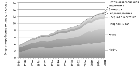 Рис. 1. Мировое энергопотребление по видам топлива, тнэ, млрд[95]