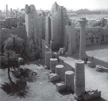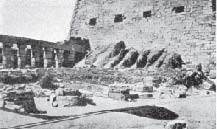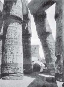 Но вот в 1899 г. внезапно рухнуло одиннадцать колонн гипостиля; еще немного, и, подобно карточному замку, такая же участь постигла бы и остальные колонны.