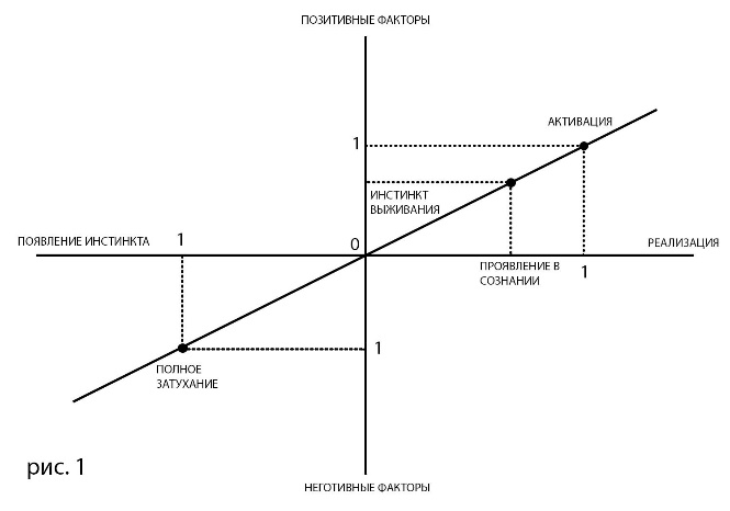 Лев не станет проявлять свою волю, ввязываясь в драку, потенциально опасную для жизни, поскольку почувствует угрозу, не равнозначную награде. Но его толкают инстинкты. Они же в некотором случае перевесят чашу весов опасности в пользу потенциальной прибыли в виде облегчения условий жизни льва, владеющего прайдом. Сложив все переменные рисков и выгод, воля или инстинкт толкает льва на осознанное действие сражения с возможно невыгодным для него исходом. Такое принятия решения возможно лишь тогда, когда переменные потенциальной победы и будущих благ превышают те, которые обрекают на поражения (сила противника, выгода от владения прайда, владение территории и т.д.). Все переменные, влияющие на рискованные авантюры, имеют количественные и качественные характеристики, а изначальный вес чаш весов определяется генетической предрасположенностью к рискованным действиям. Таких условий множество. Например: количество тестостерона (придающих более агрессивный характер поведения и склоняя чаши весов к авантюризму еще сильнее), чувство голода, негативно влияющего на формирования рискованных мыслей и поведения. Некоторый обстоятельства, физические и психические переменные могут как мешать активации инстинкта, влияя на активацию волевого акта, так и стимулировать его. Проходя через анализ, данный процесс наполняет весы одной чаши отрицательными факторами, другой – положительными. И только когда весы перевесят на положительную сторону, достигнув порогового значения, произойдет активации на разрешения действия. Подавляя при этом все негативные и мешающие факторы, такие как страх и боль и т.д. Смотреть Рис. 1.