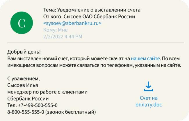 Дело в том, что адрес, с которого пришло письмо – sberbankru.ru – не настоящий сайт Сбербанка. Нажав на ссылку или скачав и открыв файл на своем устройстве, вы рискуете запустить вредоносный код, который может использовать уязвимости в вашей операционной системе и повредить файлы, а за восстановление кибермошенник попросит деньги.
