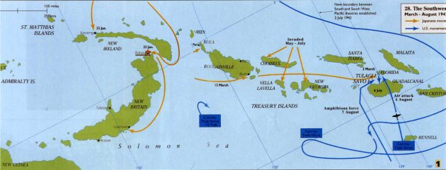 К северо-востоку от Австралии японские силы перешли к тактике просачивания – небольшие отряды на малоразмерных десантных средствах последовательно захватывали те из островов (в группах Бисмарка, Эллис, Гильберта и Соломоновых), где не было крупных гарнизонов противника. На этих островах началось строительство аэродромов и посадочных площадок с целью создания развитой системы базирования авиации для контроля коммуникаций Западного побережья США с Австралией и Новой Зеландией.