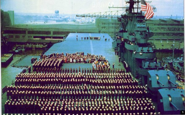 1. Церемония подъема флага на новом авианосце «Лексингтон» (типа «Эссекс»)