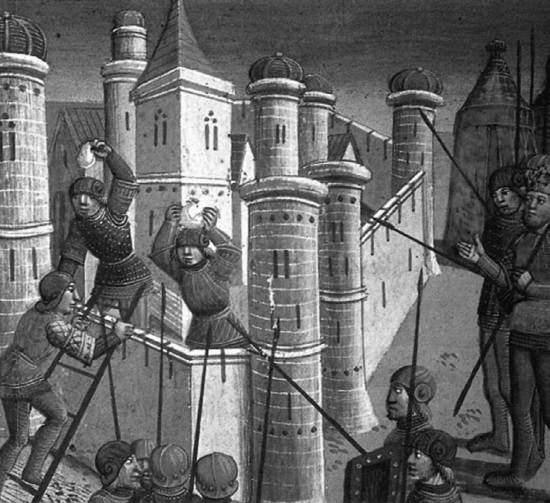 Когда в таких ежедневных боях прошло двадцать пять дней, безбожный приказал снова прикатить ту огромную пушку, ибо, надеясь скрепить, ее стянули железными обручами. И когда выстрелили из нее, тотчас же разлетелась пушка на множество частей. Он же, безверный, увидев, что постигла его неудача, вскоре приказал, собравшись всей силой, подкатить к стенам огромные крытые туры. И когда установили туры по всему краю рва, хотели, заполнив рвы бревнами, хворостом и землей, придвинуть и прислонить туры к стене и так, подкопавшись под стену во многих местах, обрушить ее на землю. И когда люди, приступив во множестве к стенам, стали засыпать рвы, горожане зажгли сосуды с порохом, закопанные по ту сторону рва, и внезапно загремела земля, словно гром великий, и поднялась вверх с турами и с людьми, как от бури сильной, до самых облаков, и был так страшен треск рушащихся тур и вопли и стоны людские, что побежали и те и другие: горожане со стен – в город, а турки – подальше от стен. И падали с высоты люди и бревна: одни в город, а другие на войско, и рвы наполнились трупами турок. И когда взошли снова горожане на стену и увидели во рве множество турок, тотчас же зажгли бочки со смолой и побросали на них, и те все сгорели. И так с Божьей помощью избавился город в тот день от безбожных турок…