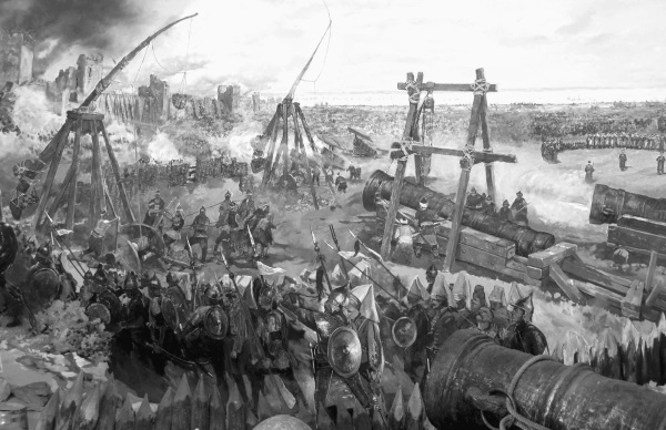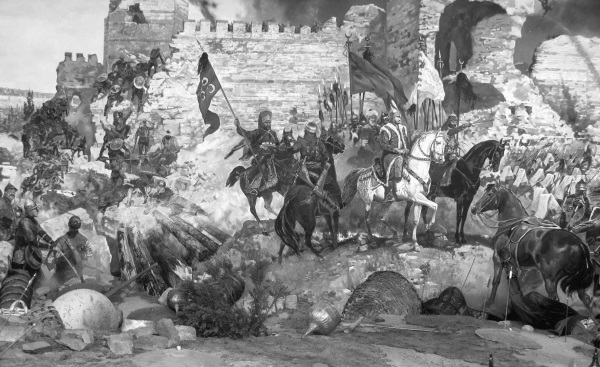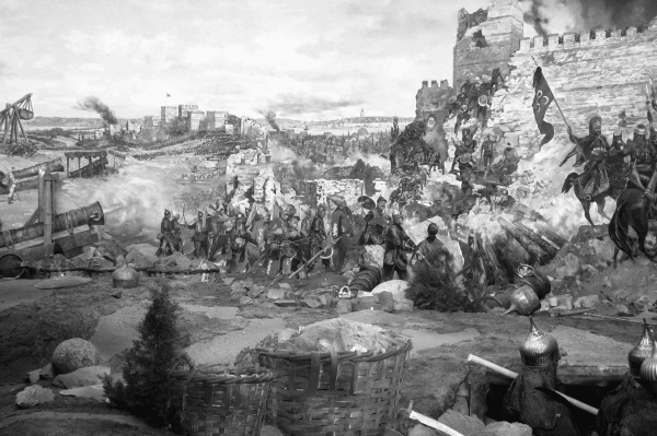Осада Константинополя была первым и последним в истории человечества сражением, где одновременно применялось оружие античности, Средних веков и Нового времени – метательные машины, «греческий огонь» и пушки. Любопытно, что у ворот Святого Романа турки скрепили с огромной бомбардой две малые, стрелявшие ядрами в 50 фунтов. С их помощью производилась пристрелка большого орудия. «И тогда по прицелу стрелял и из самой большой. И когда ударил первый выстрел, и услышали жители города треск, они онемели от ужаса, а затем стали кричать: "Господи, помилуй!"».
