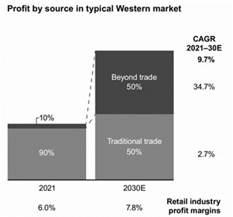 Взаимопроникновение и новые прорывные розничные бизнес-модели разрушают структуру прибыли в розничной торговле, которая находится на грани значительных изменений. Ожидается, что традиционная торговля, направленная на простые продажи товаров от поставщиков, будет обеспечивать только умеренный рост прибыли до 2030 года. Вместо этого значительная доля роста прибыли будет приходиться на деятельность, выходящую за рамки традиционной розничной торговли.