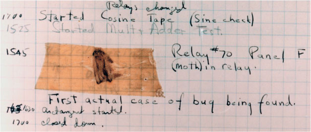 Тот самый мотылек, закоротивший контакты реле в компьютере. Запись гласит: «Первый подтвержденный случай обнаружения бага»
