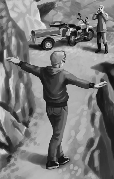 Лёшка остался стоять на дороге. Ему казалось, что мотоцикл, да еще с прицепом, ни за что здесь не пройдет, но отец все же въехал на тропу, тихонько тронулся вдоль края обрыва. Лёшка со страхом наблюдал, как на узких участках колесо люльки нависает над краем тропы, а отец боком почти касается скалы. Захотелось зажмуриться и ничего этого не видеть, но он продолжал стоять и смотреть, чувствуя, как от страха по вискам течет пот. Но вот самый узкий участок дороги был пройден, отец немного прибавил ходу, вырулил на широкую площадку, остановился, сошел с мотоцикла и махнул сыну рукой.