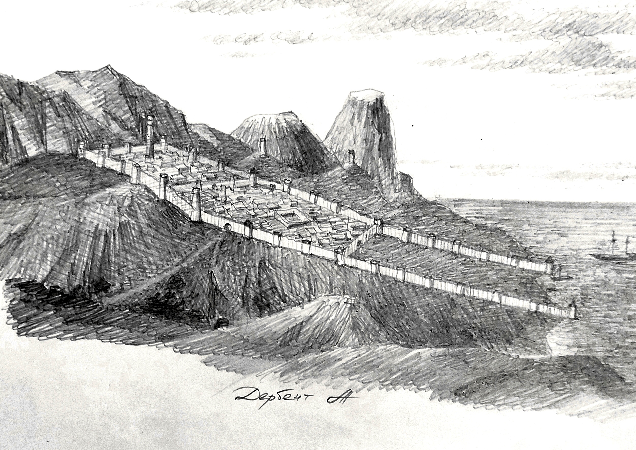 – Дербент грозная крепость и не так-то просто её взять! Вот как описывали её путешественники, читаю: «Дербент город каменный белый, бывал крепок, только не люден, а стоит концом на горы, а другим концом в море, а длиною в горы больше трех верст, а поперек города саженей с триста и поперек город перегорожен каменными стенами в двух местах, и представляет собой три города.