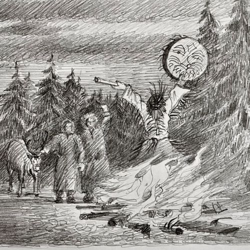 Пляшущие тени от костра пугали онемевших оленеводов в предчувствии чего-то неведомого и неизбежного. Шаман, одетый в яркий костюм с разноцветными ленточками, бренчал металлическими подвесками и приплясывал с огромным бубном и колотушкой в руках. Волосы шамана и ленты, свисающие из-под головного убора с пришитыми жуткими белыми глазами, плотно закрывали его лицо и имели устрашающий вид. Ниспадающие волосы шамана в такт ударам колотушкой в бубен открывали его хищное лицо, раскрашенное цветными зловещими полосами. Тунгусы от пронизывающего взгляда шамана в страхе шарахались, а его ритуальная пляска продолжала убыстряться. Бубен, с изображением извивающейся змеи, от ритмичных ударов колотушкой издавал вначале дребезжащий рокот, постепенно доходящий до силы громовых раскатов, грохотал всё громче и громче. При этом шаман в экстазе пел своим заунывным речитативом, притоптывая в такт ударам в бубен.