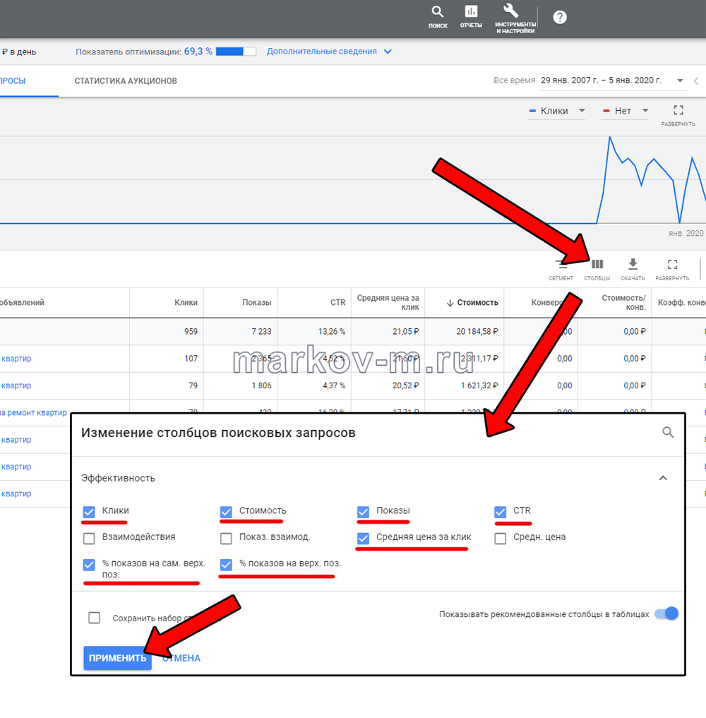 Приведенная статистика показывает самое главное – по каким фразам(столбец поисковый запрос) кликали на ваши объявления. Но помимо этой информации можно получить еще дополнительные данные. Чтобы вывести дополнительные значения в таблице кликаем на значок «столбцы» и отмечаем в подразделе Эффективность: «Клики», «Стоимость», «Показы», «CTR», «Средняя цена за клик», «% показов на сам. верх. поз.»(1 место), «% показов на верх. поз.». Далее жмем «Применить».