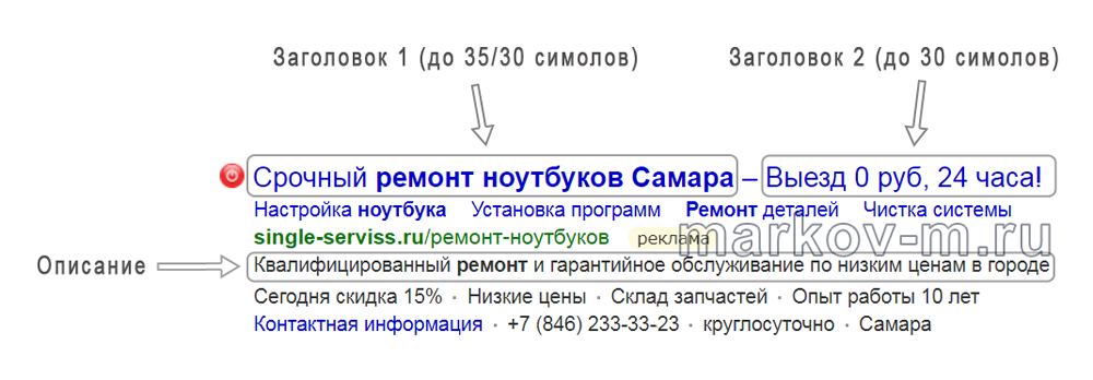 В Яндекс директ и Google ads есть ограничение на количество знаков в Заголовке 1(до 35 символов в Яндексе и до 30 в Google), Заголовке 2(до 30 символов) и тексте объявления(до 82 символов у Яндекса и 90 у Google). Наша задача – уместить как можно больше текста в Заголовок и описание, чтобы объявление занимало максимально возможное место на странице и было более заметно. Желательно, чтобы у вас оставалось не более 5 пустых символов, т. е. если в описании максимум 82 символа(90 у Google), то желательно заполнить его минимум на 77 символов(85 для Гугл).