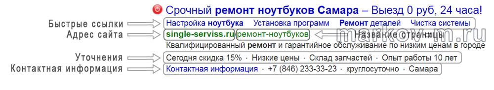 Быстрые ссылки – представляют блок ссылок на основные разделы сайта, его также желательно заполнить, чтобы сделать объявление более заметным.