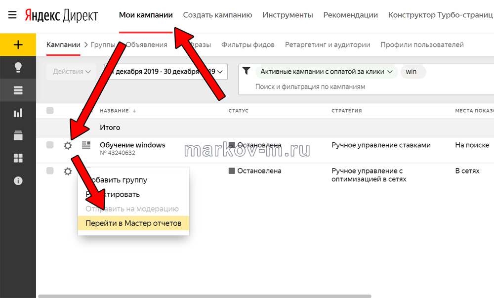 Вначале проверим, по каким фразам к вам заходили на сайт из Яндекс директ. Переходим в раздел «Мои кампании», кликаем на значок шестеренки напротив нужной кампании и выбираем «Перейти в Мастер отчетов».