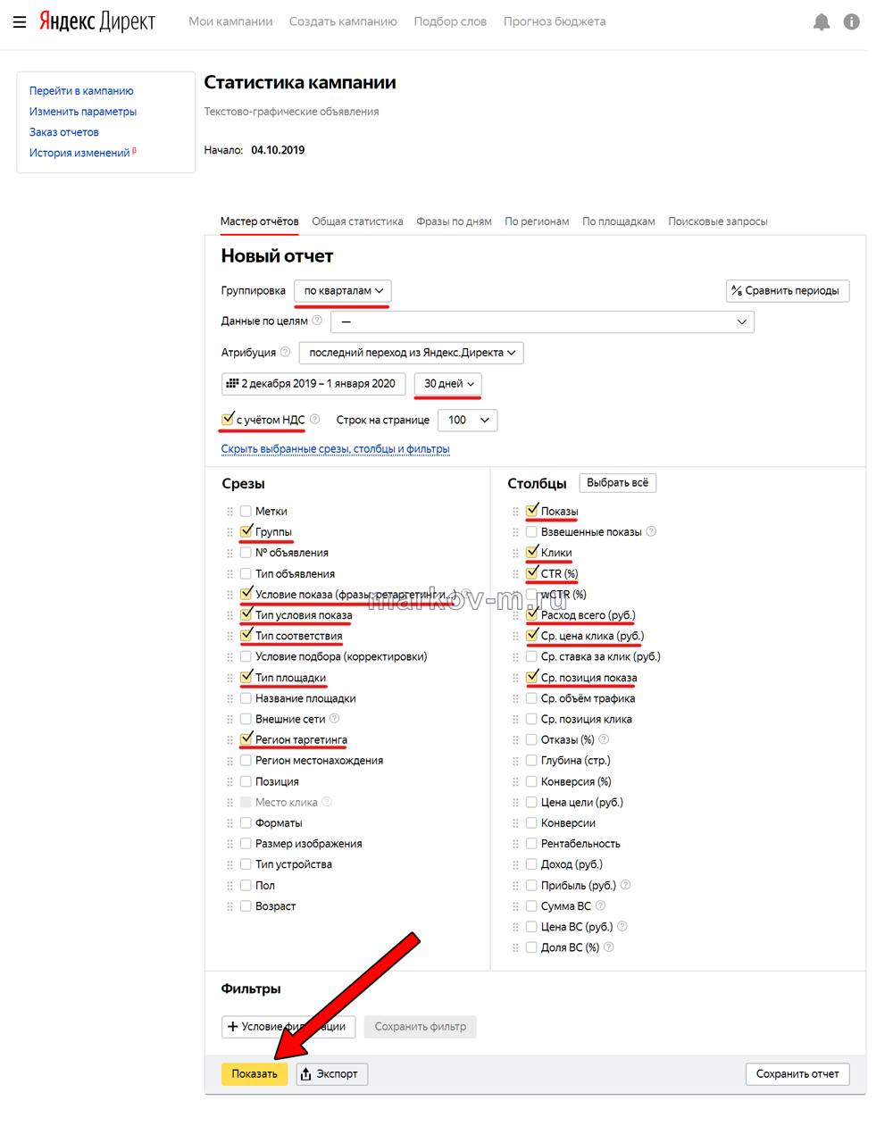 В колонке «Срезы» отмечаем галочкой: «Группы», «Условия показов», «Тип условия показа», «Тип Соответствия», «Тип площадки», «Регион таргетинга»;