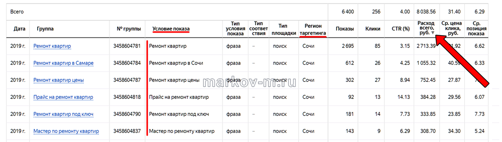Кликаем: «Показать» и получаем статистику по фразам и группам объявлений. Полученная таблица неудобна для восприятия, т.к. по умолчанию сортировка идет по номеру группы. Для того чтобы получить интересующие нас данные, нужно сделать сортировку по сумме расходов каждой фразы, кликнув на заголовок оглавления столбца «Расход всего, руб.». В результате данные отсортируются по сумме расходов на группу объявлений и вы сможете посмотреть, по каким фразам больше всего списывается денег.