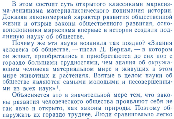 Итак, начнем наши подготовительные размышления чтением основательного учебника для вузов СССР периода «развитого социализма», непосредственно относящегося к теме общественного прогресса [10]. Думается, это и дополнительное ознакомление с научно-исторической литературой [11—16] целесообразно направят мышление читателей по актуальной и особо значимой для современной России проблематике. Здесь необходимо привести довольно обширную, но совершенно необходимую выдержку из указанного учебника, – для глубокого понимания современной ситуации в России и других странах в отношении состояния «общественных наук», – в сущности, мышления о самости, о путях и организации общественного развития, а также мышления в государственном управлении общественным развитием. Надо обратить внимание читателя на то, что этот учебник следует читать и осмысливать значение наук для общественного прогресса, понимая политическую детерминацию того периода для авторов учебников и понимая, что речь теперь должна идти не о марксизме-ленинизме, как «подлинной науке об обществе», а о научном самопознании на базе выверенных знаний и адекватной методологии познания общества, которой, несомненно, является «организационно-системная» методология, основанная и развитая Александром Богдановым, Л. фон Берталанфи и многими последователями, в том числе советскими философами. Итак, автор учебника, в главе «Роль общественных наук в социальном прогрессе», в разделе «Знание законов общественного развития – основа сознательного управления жизнью общества» приводит следующие высказывания на эту тему, начиная с общего вывода известного историка науки и общества Д. Бернала (из его книги «Наука в истории общества»). Думается, их актуальность хорошо видна, особенно для современной России: