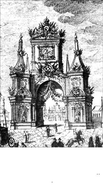 Это с одной стороны ворот, а с другой – «любовь к отечеству, в лице жены, город на руках пестующей». И еще разнообразные декоративные элементы, как-то: статуи святых апостолов Петра и Андрея, картины баталий и атак, провидение в лице царицы с корабельным кормилом, державой и царским глобусом в руках и т. д. А надо всем этим парил «герб Государев, Орел позлащенный». Эмблематика триумфальных врат петровской эпохи была богатой.