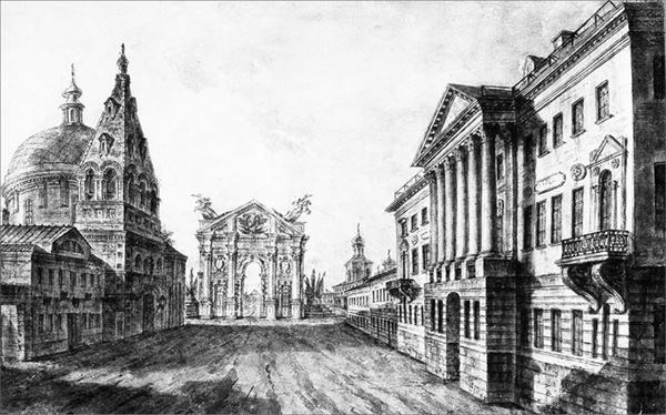 На этом рисунке Ф. Алексеева (1801 г.) Триумфальные ворота на Страстной площади изображены художником уже более детально и с другой стороны. Рисунок выполнен вскоре после коронации Александра I. Слева от ворот – церковь Димитрия Солунского с колокольней. Триумфальные ворота резко контрастируют с их окружением, создающим картину патриархальной и бывшей столицы начала XIX века.