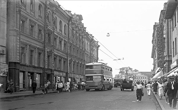 Привлекает внимание, конечно, двухэтажный троллейбус – примета довоенной Москвы. На заднем плане – «труба» кинотеатра «Центральный», а за ним – дом Сытина.