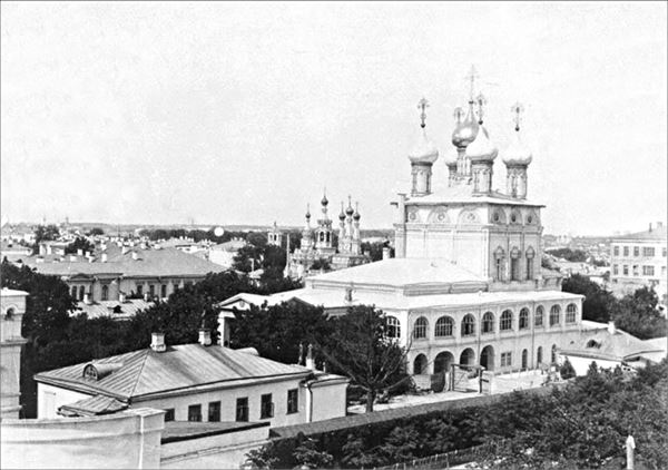 Вид на Страстной монастырь со стороны Малого Путинковского переулка. Редкое фото – обычно монастырь снимали со Страстной площади. На дальнем плане – сохранившаяся до наших дней церковь Рождества Богородицы в Путинках.
